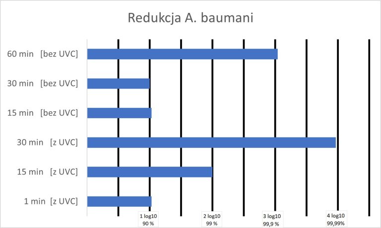 wykonanego na szczepach modelowych: Enterococcus hirae, Escherichia coli, Staphylococcus aureus, Pseudomonas aeruginosa, Acinetobacter baumannii